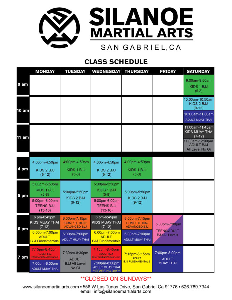 • 4:00 PM – 4:50 PM: Kids 2 Jiu-Jitsu (Ages 8–11)